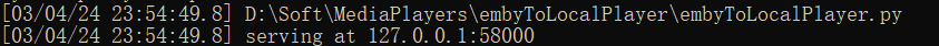 - 开启脚本测试 - 双击 - embyToLocalPlayer_debug.bat,并选择- 1: run in console,看到有如图提示时即为本地脚本开启成功(先不要关闭 CMD 窗口!)