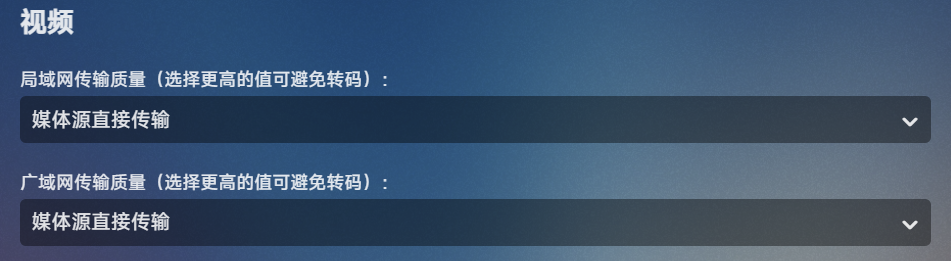 - 「视频」下的「局域网传输质量」与「广域网传输质量」均设置为「媒体源直接传输」;
