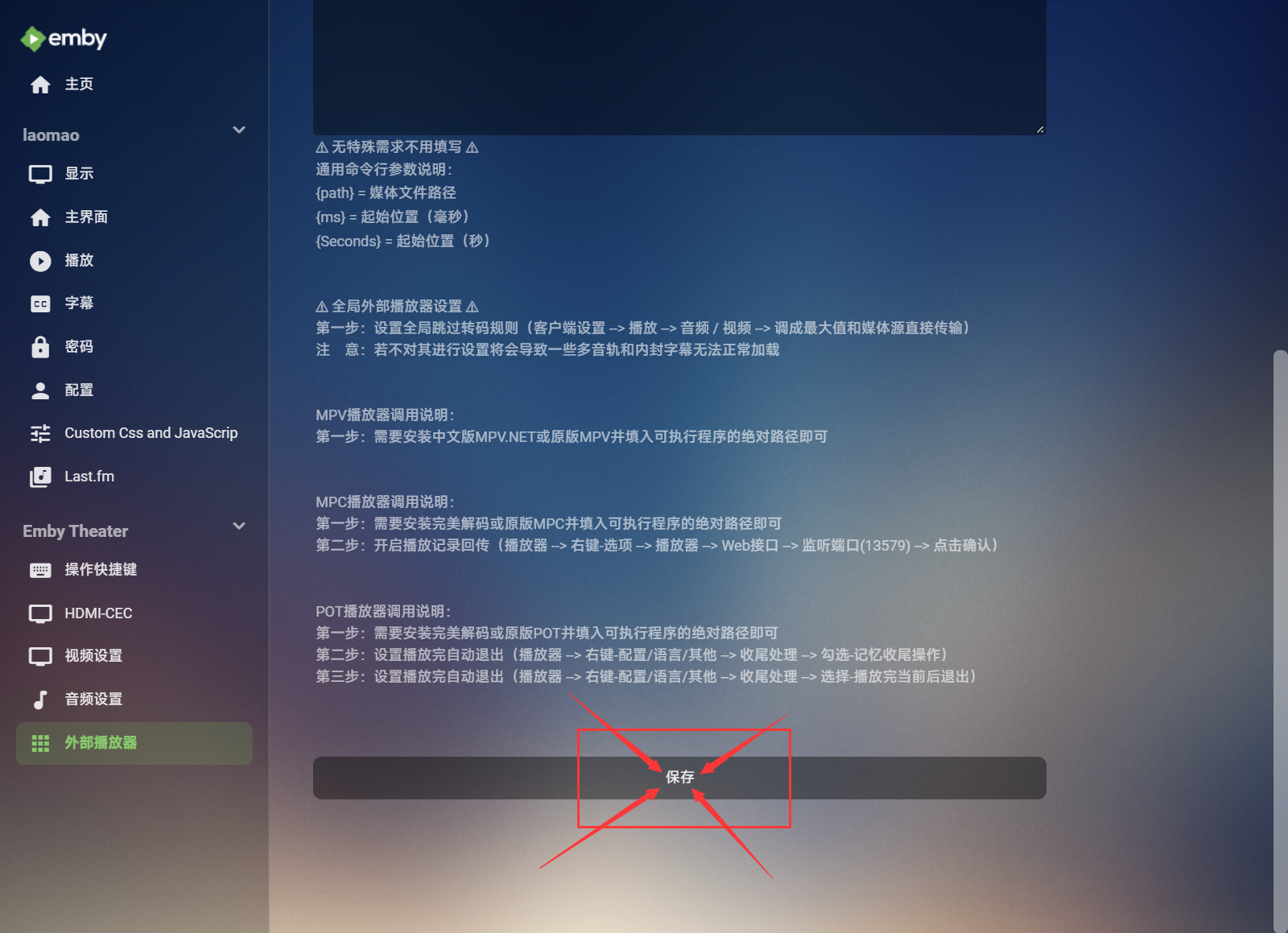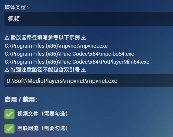 - 路径(媒体类型下方的空行):你的播放器绝对路径,无需输入转义符