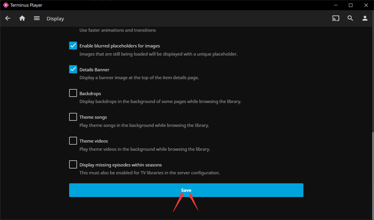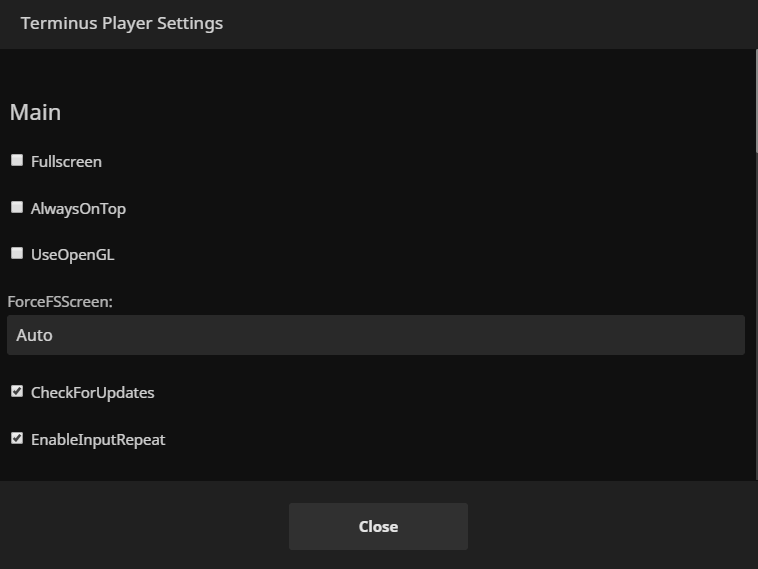 - 取消勾选 ChechForUpdates (检测更新)。因为此功能是 Jellyfin 官方的,如果不慎更新则会覆盖 Terminus Player 修改的部分,造成无法观看 Emby 资源