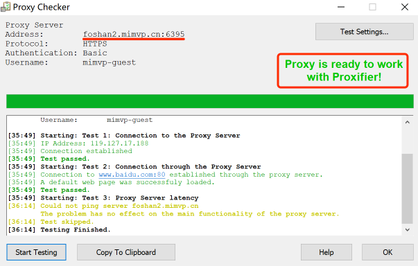 - 点击 - Check检查代理可用性,当出现如图字样则表示代理可用,之后点击 OK 保存即可