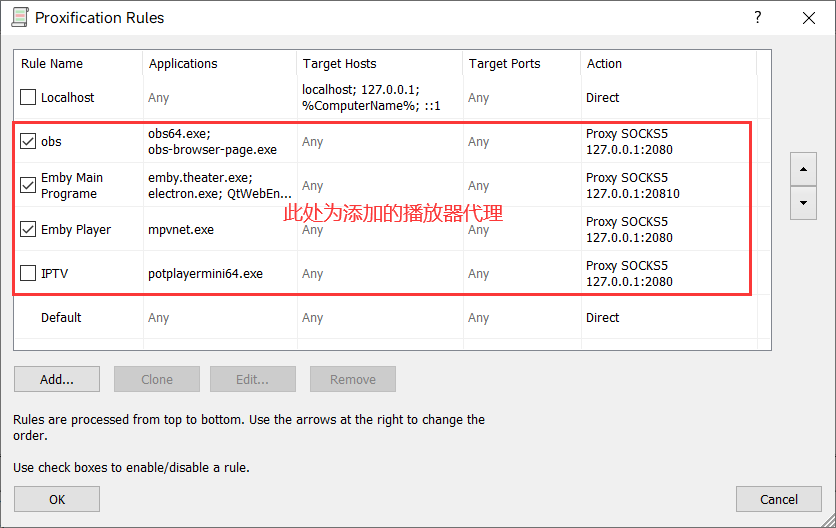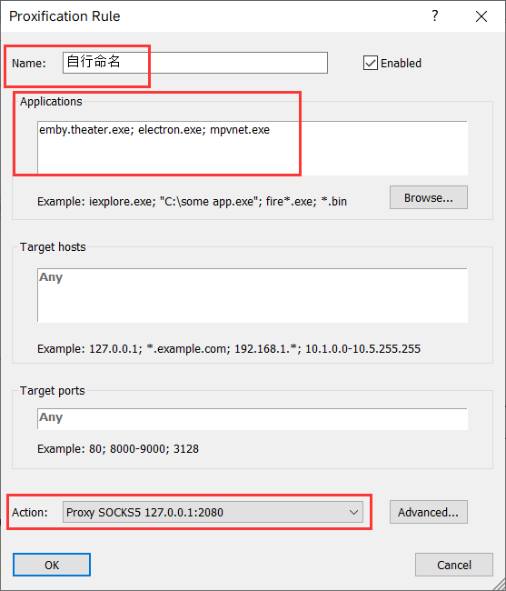 - 在 Name 栏填写规则名称(随意命名)、在 Applications 里添加需要代理的软件,在 Action 里选择代理流向(如存在多代理情况),点击 OK 保存  - 💡 部分播放器工具进程名: - Emby:emby.theater.exe; electron.exe