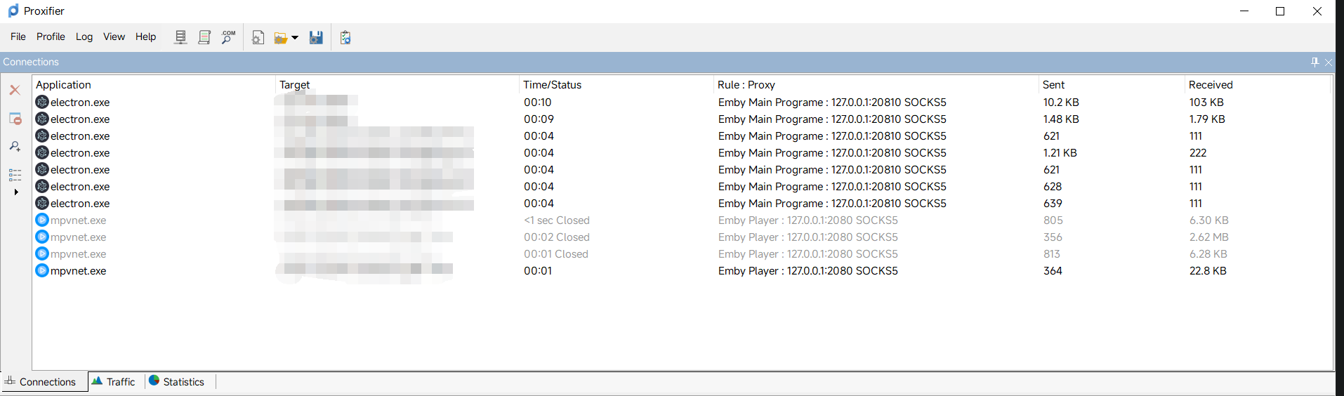播放时可以看到仅有 Emby 与播放器的流量进入 Proxifier,说明设置正常