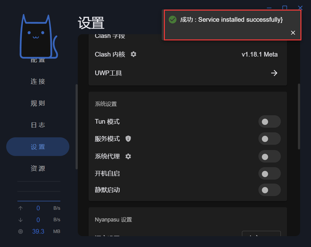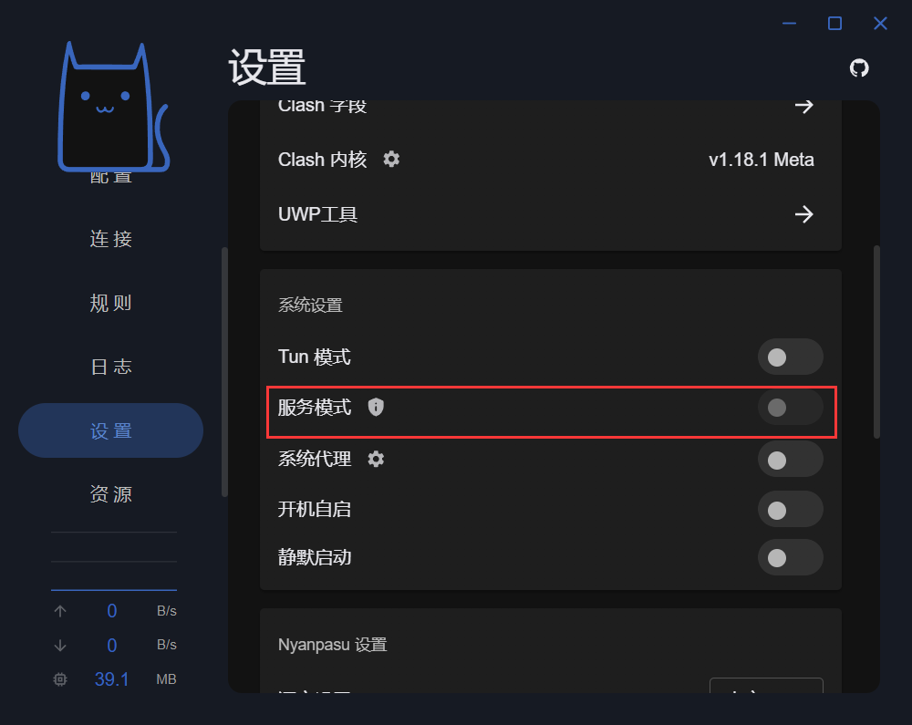 - 使用 管理员模式 打开 - Clash Nyanpasu.exe,进入 设置 菜单,找到 系统设置——服务模式