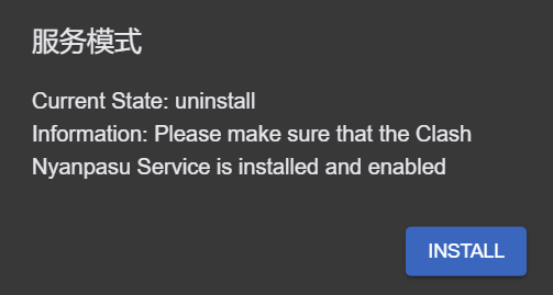 - 点击 服务模式 旁的图标,点击 INSTALL 安装,出现绿色成功提示后,打开 服务模式 的开关即可