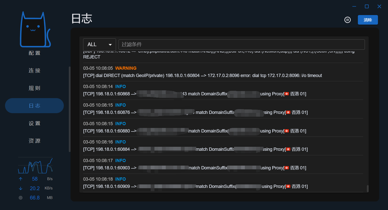 播放时查看日志,发现有来自 198.18.0.1 的流量就是 Tun 模式代理到的部分